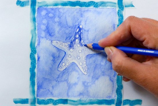 1. Töltsük le innen a tengericsillag mintát, és nyomtassuk ki. Árnyékoljuk a sablon hátulját a sötétkék akvarell ceruzával. Helyezzük a sablont (az előlappal felfelé) pontosan az akvarellpapír közepére. Az akvarellceruzával rajzoljuk le a körvonalakat és a vonalakat. Ezzel a motívumot átvisszük a papírra. Mielőtt eltávolítaná a sablont, ellenőrizze, hogy minden vonal átkerült-e.