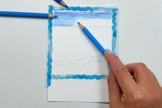 4. A permet fölött színezzük a vizet homokszínűre. Ezután váltsunk világos türkiz árnyalatra, majd a horizont felé a víz színét kék árnyalatokkal mélyítjük el. Hagyjunk vízszintes fehér foltokat, amelyek később a hullámok gerincét jelképezik majd.