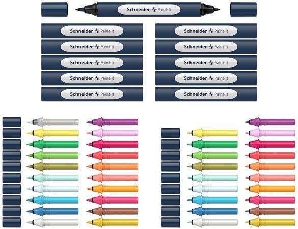 KezdőlapIrodaszerekÍrószerekGrafikai és művészeti termékekKétvégű marker készlet, 52 darabos, SCHNEIDER "Paint-It 040 Twin marker Set 1", 20 különböző szín