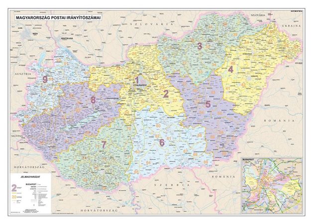 Színezéssel és határvonallal emeltük ki az egyjegyű irányítószám-régiókat és kétjegyű irányítószám-körzeteket. Ez megkönnyíti, hogy egy települést gyorsan megtaláljunk a térképen. Természetesen a telpülések irányítószámai is megtalálhatóak a nevük mellé írva (megyei jogú városoknál az irányítószám-tartomány). Budapest külön melléktérképen szerepel.